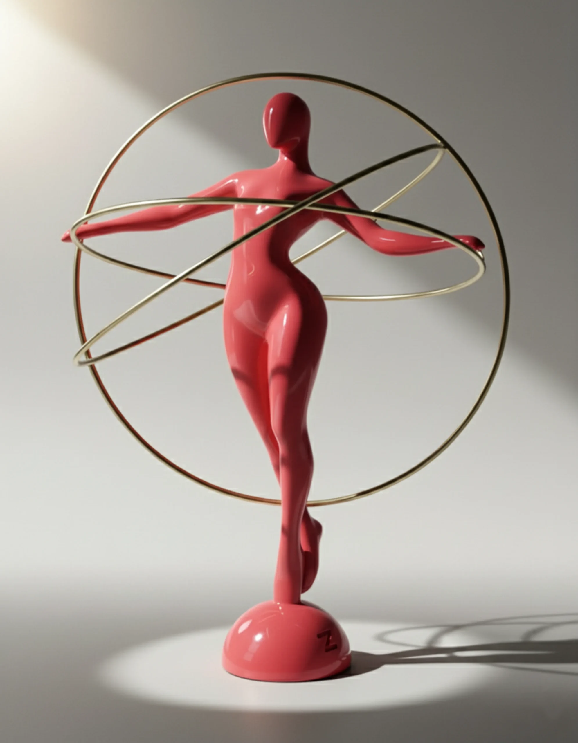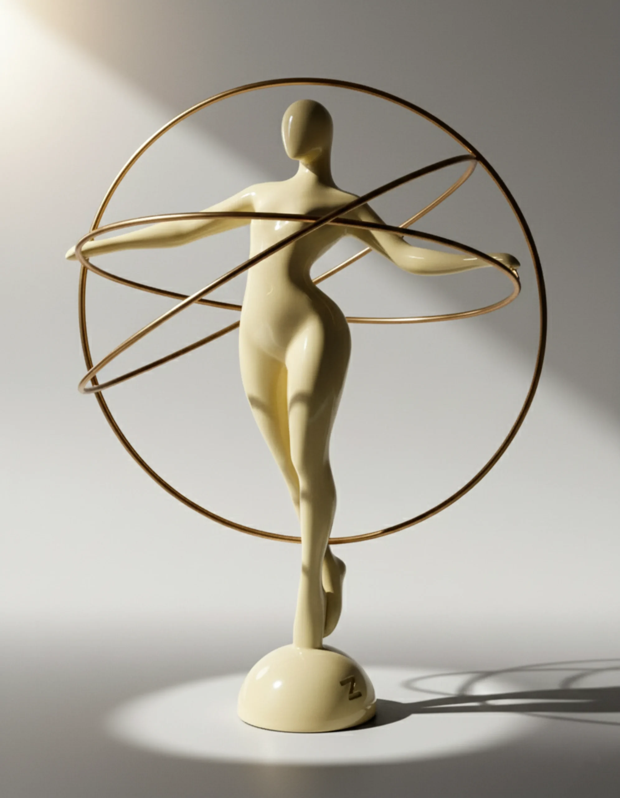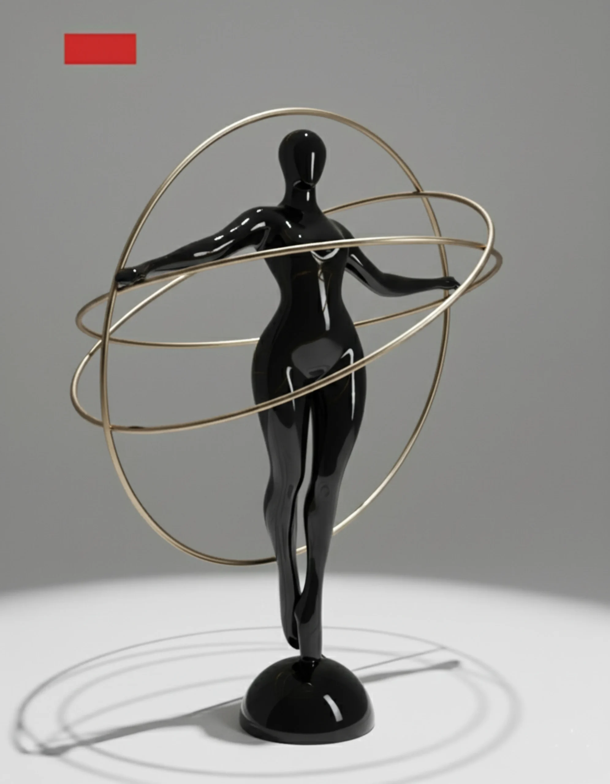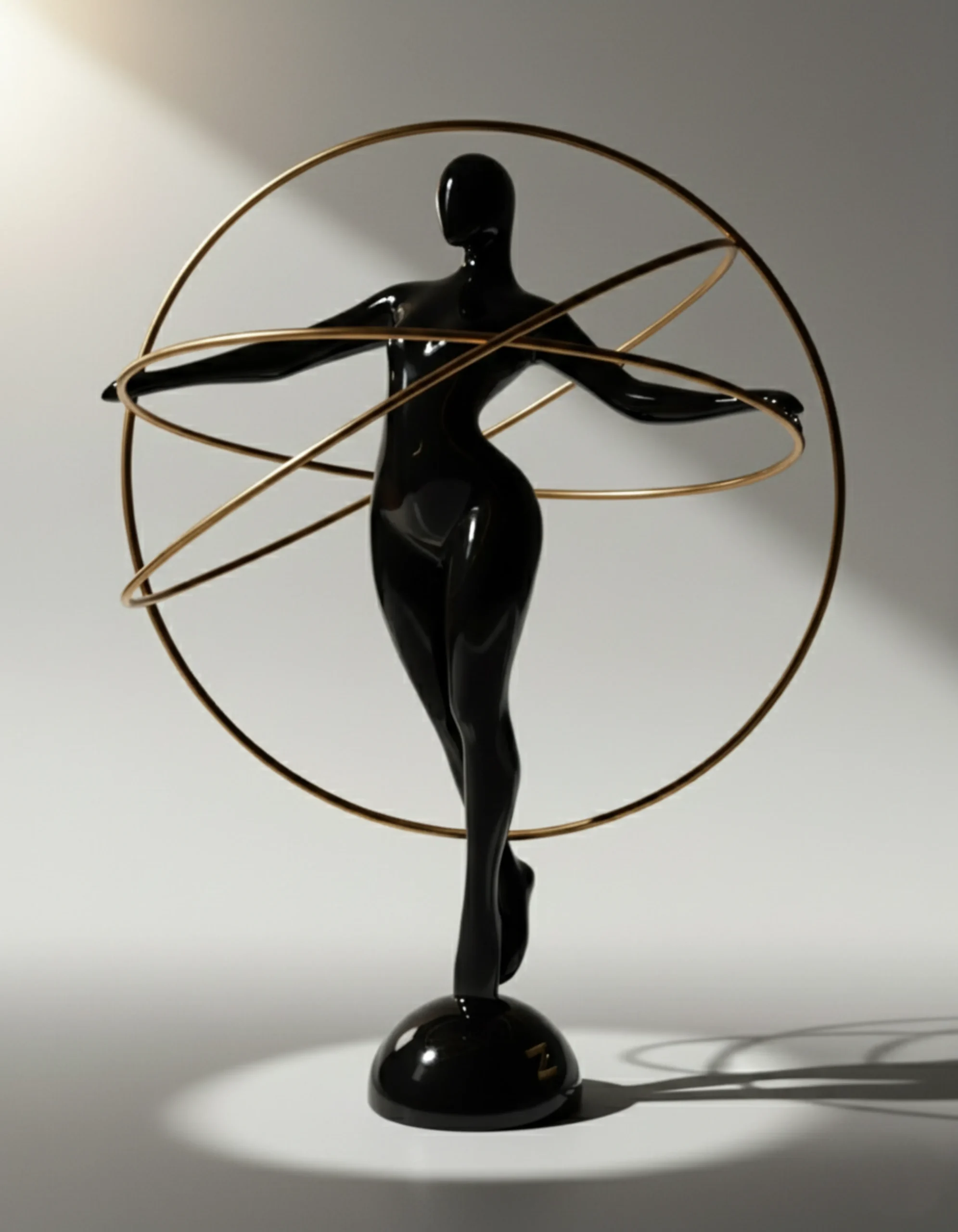 She in Orbit embodies balance – a quiet strength wrapped in fluid grace. Her form stands still while the steel rings around her seem to drift, echoing the rhythm between freedom and control.