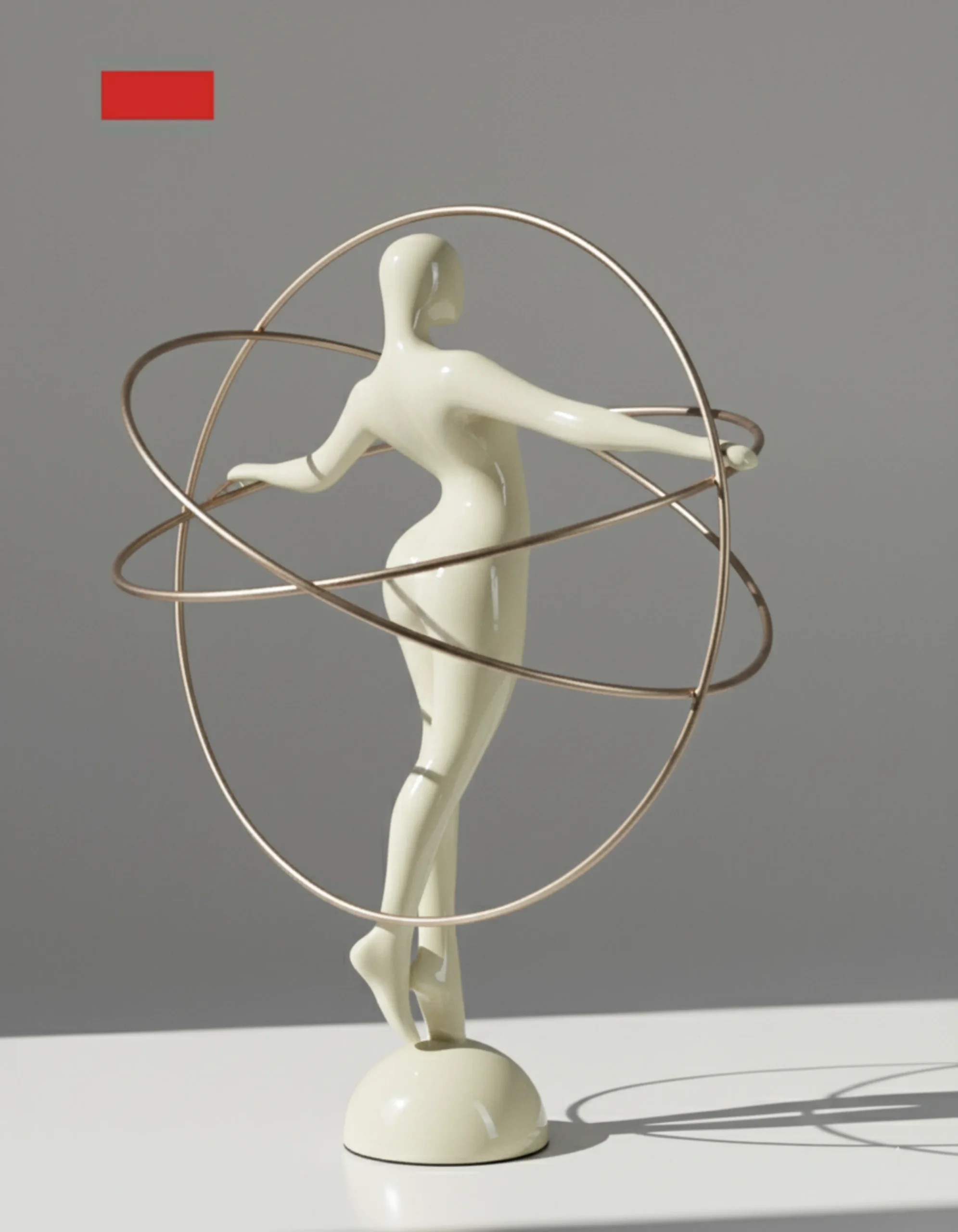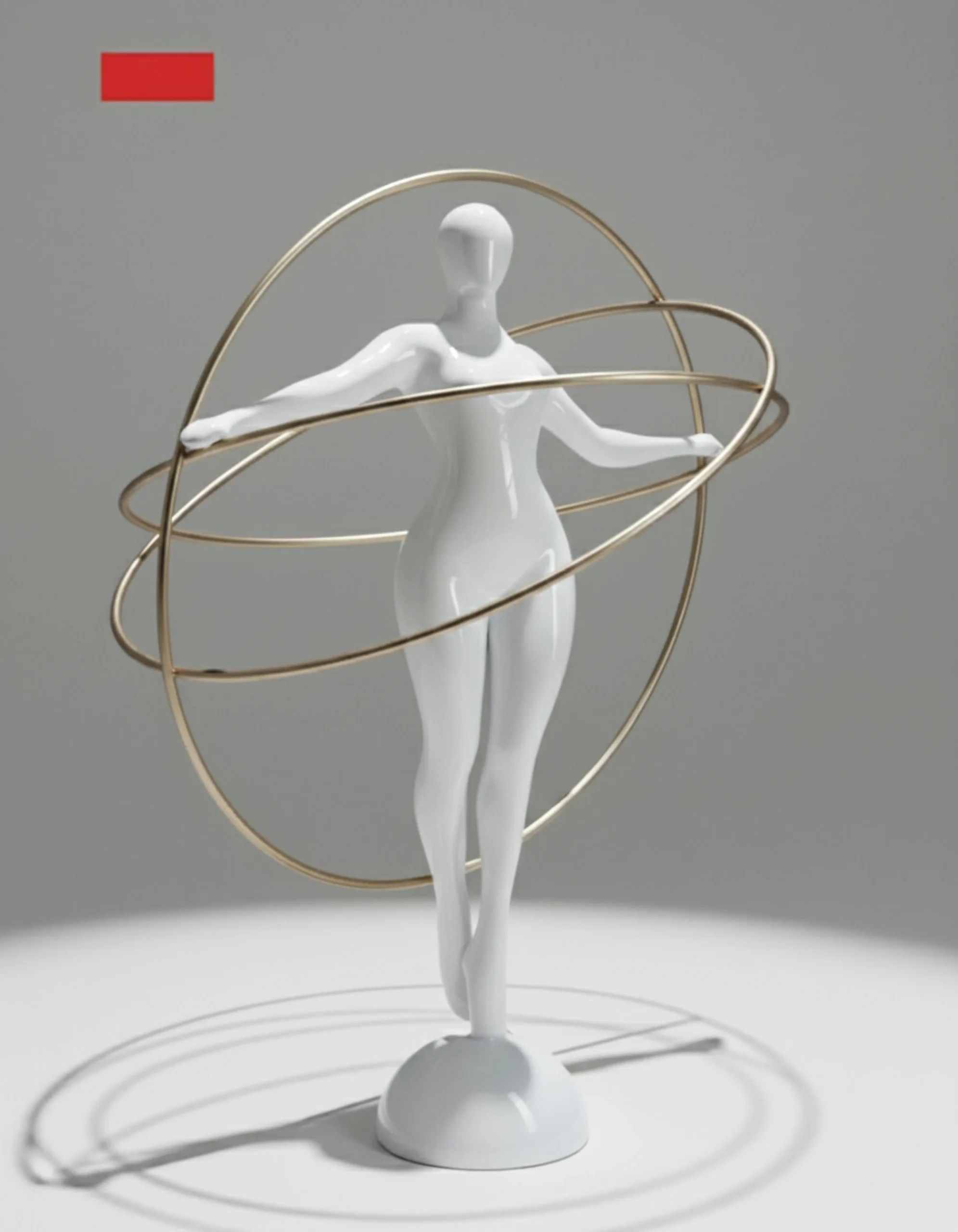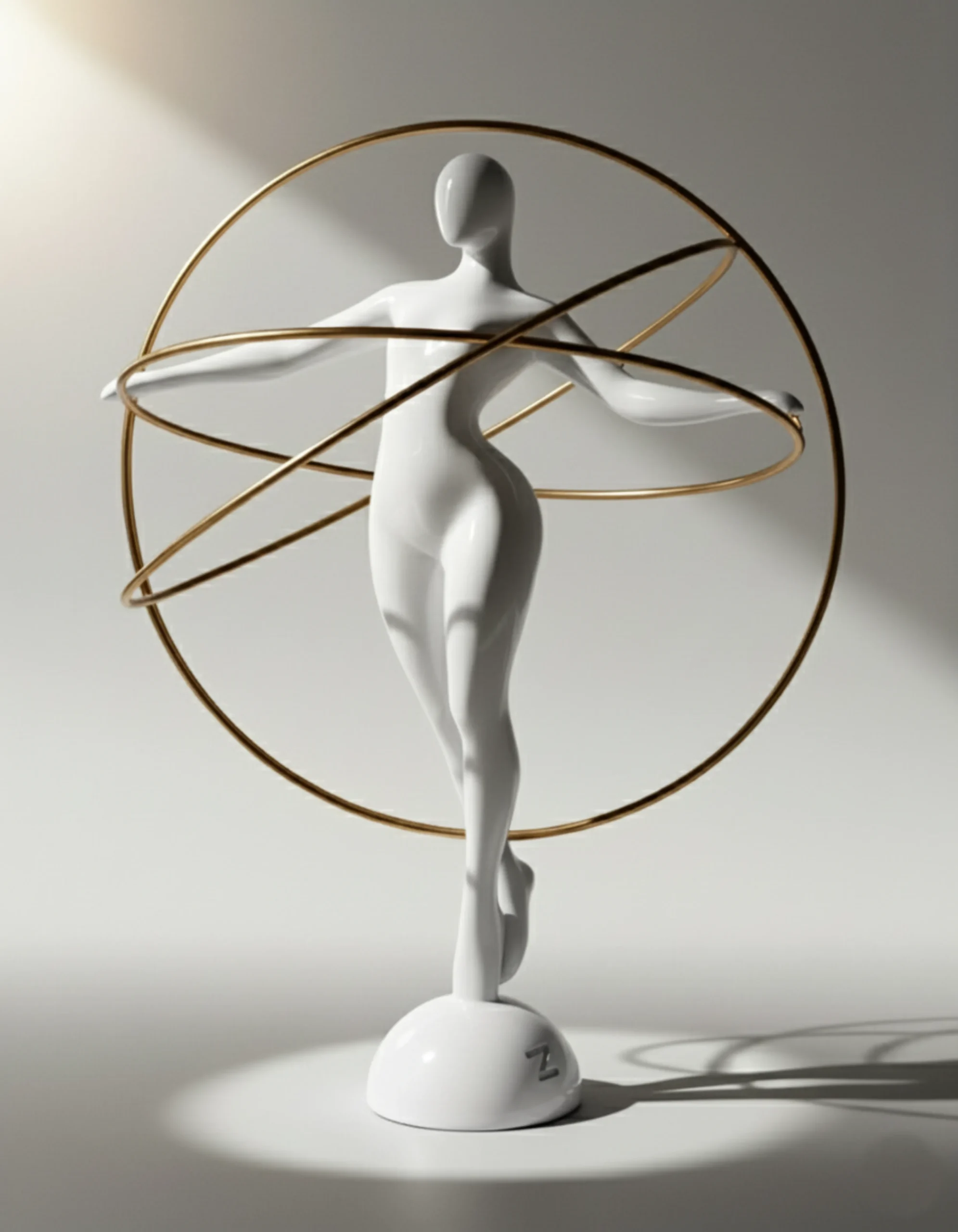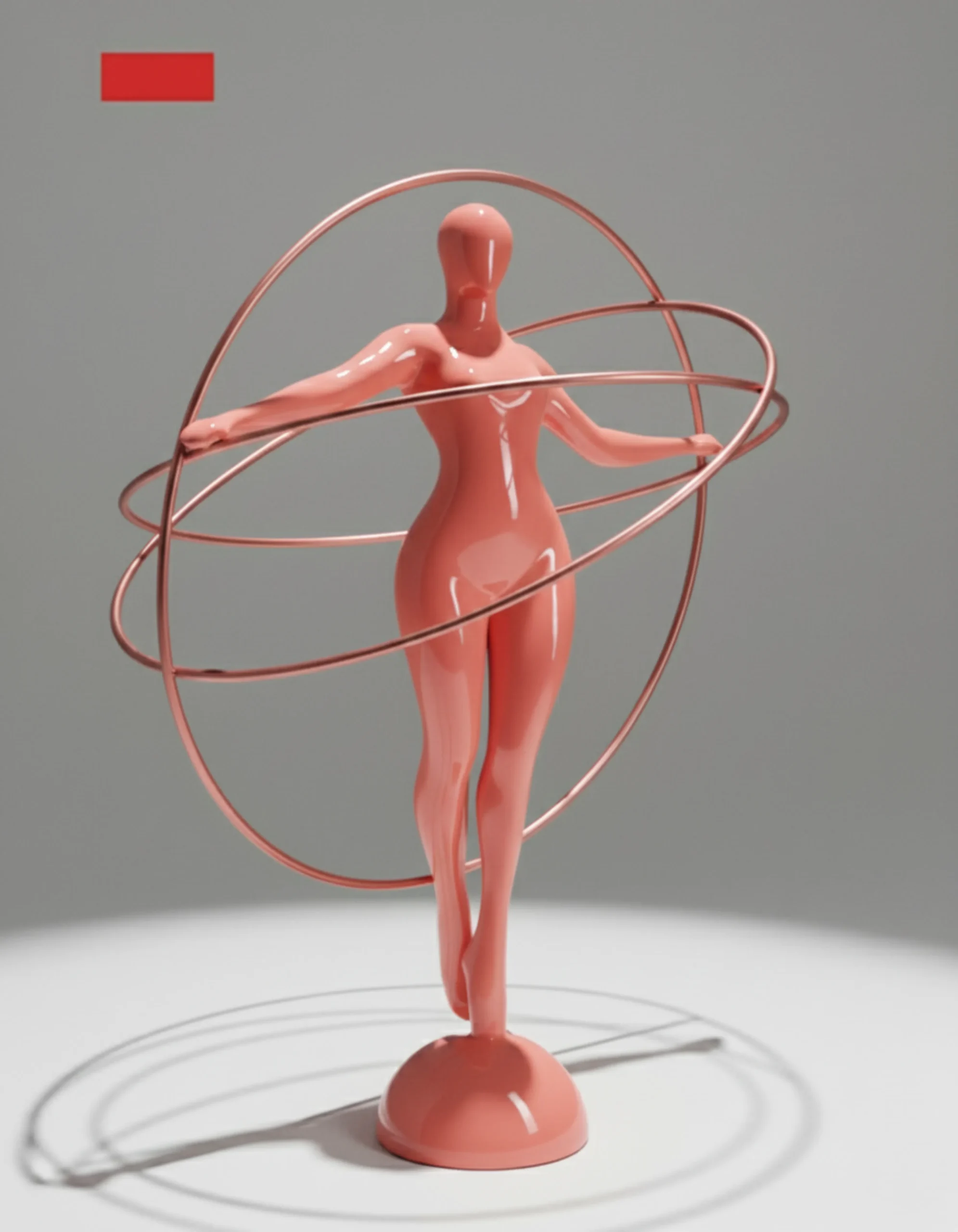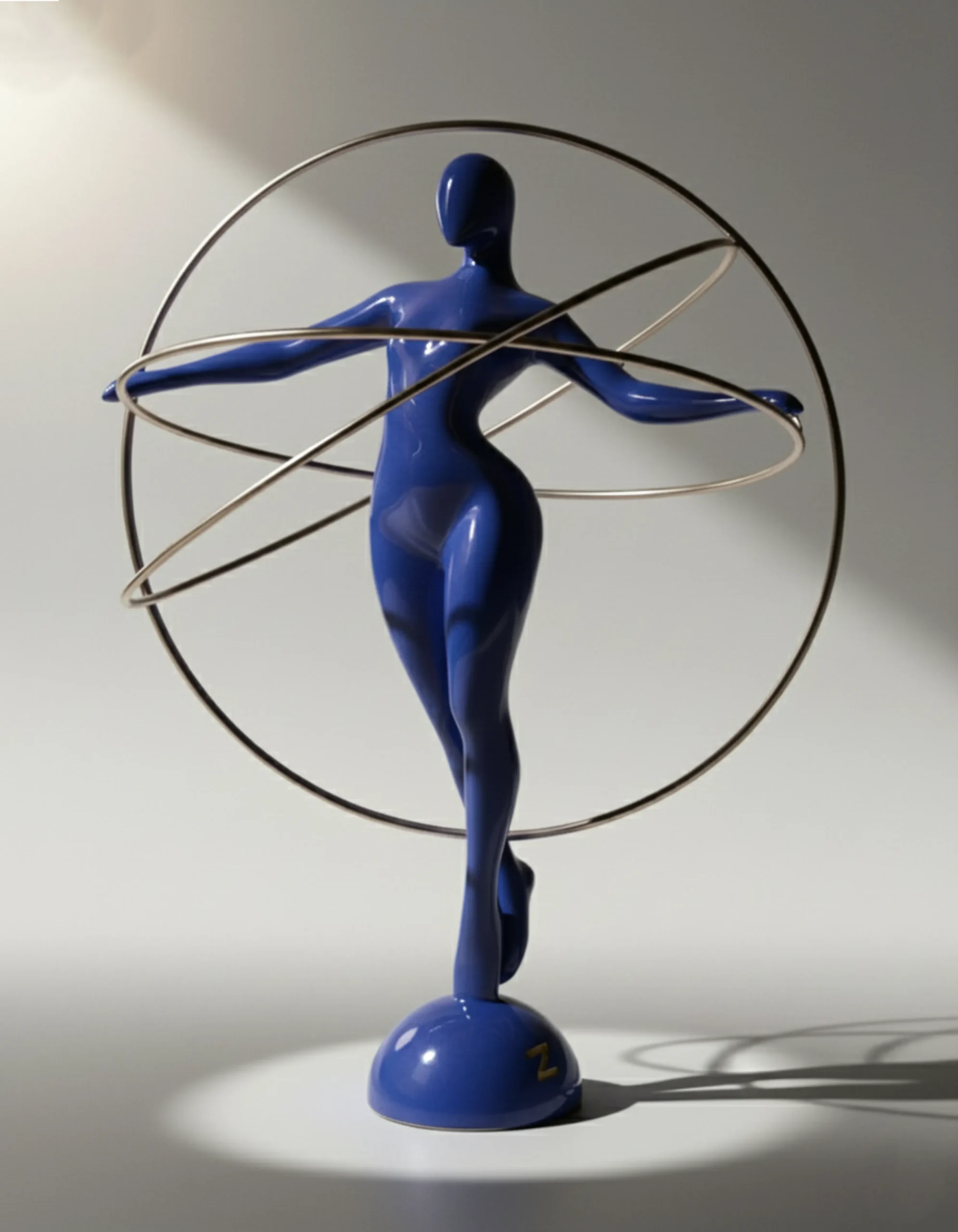 She in Orbit embodies balance – a quiet strength wrapped in fluid grace. Her form stands still while the steel rings around her seem to drift, echoing the rhythm between freedom and control.