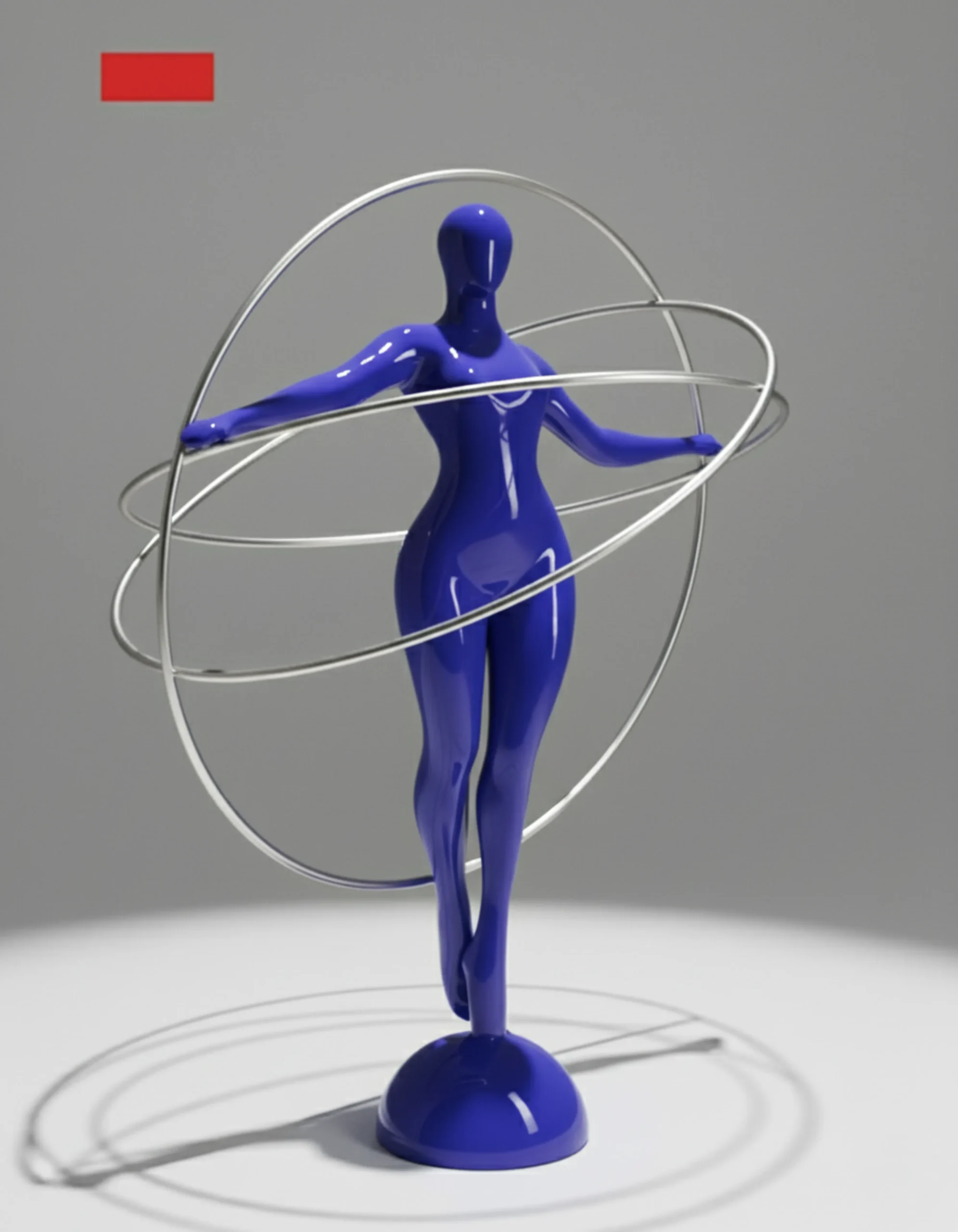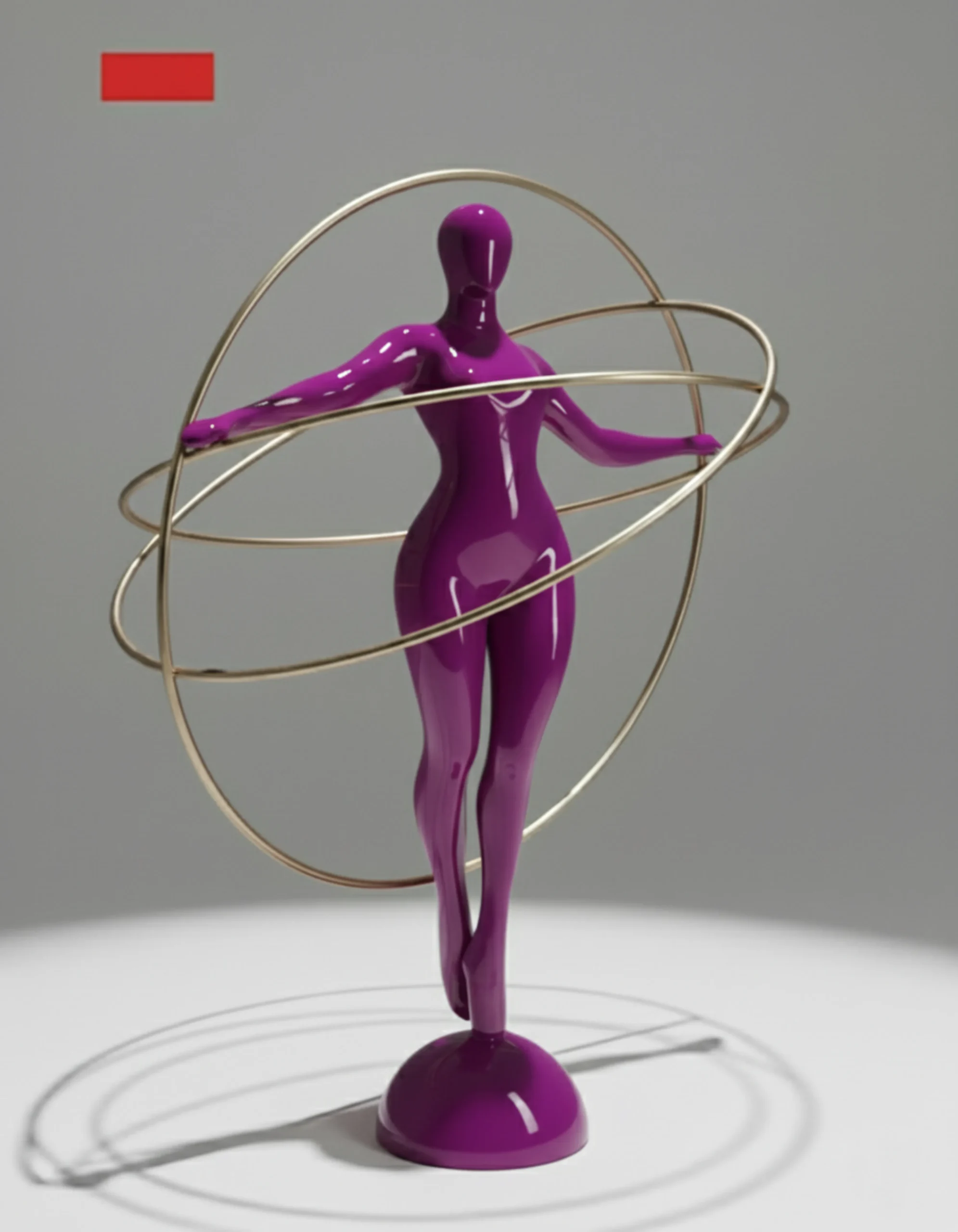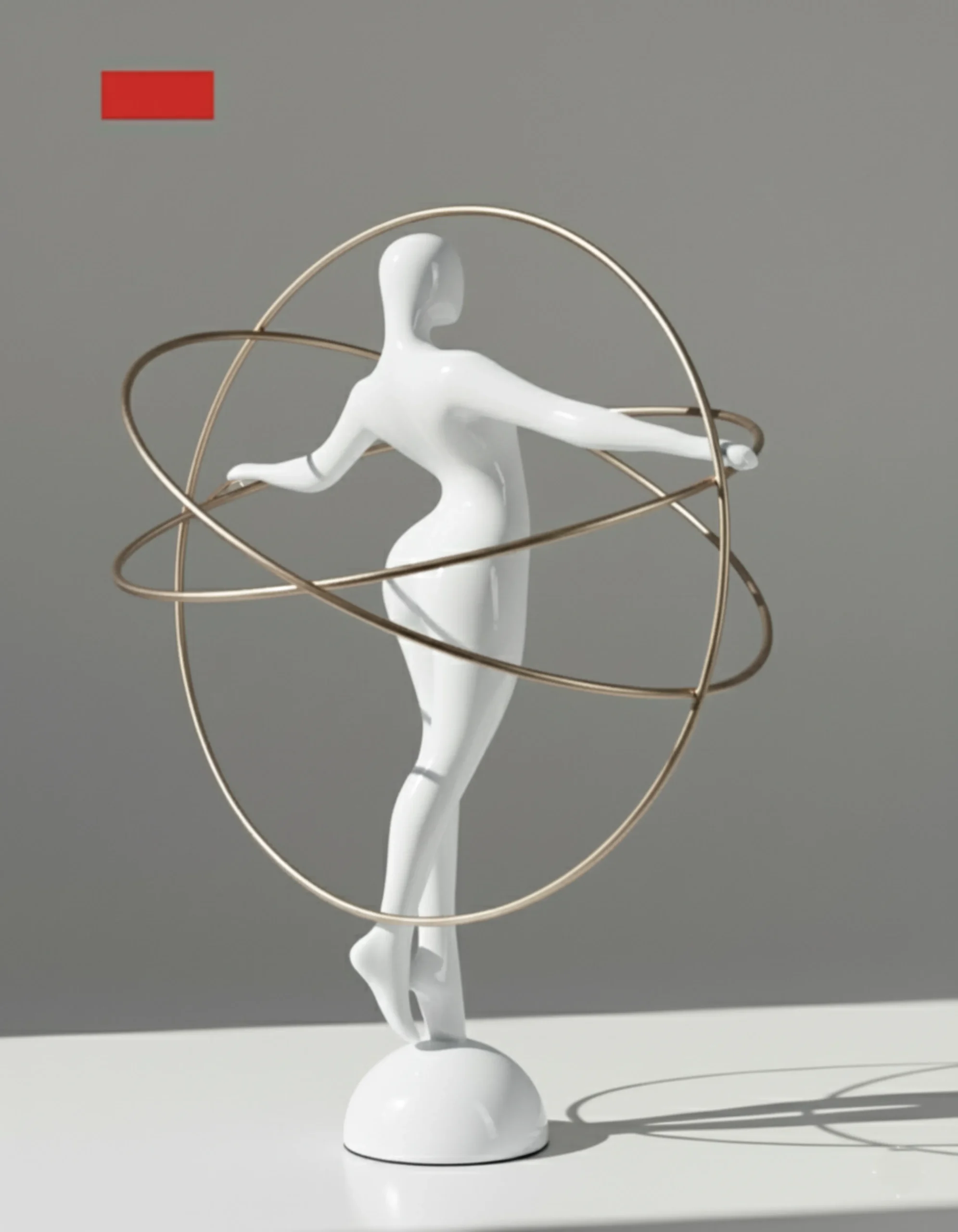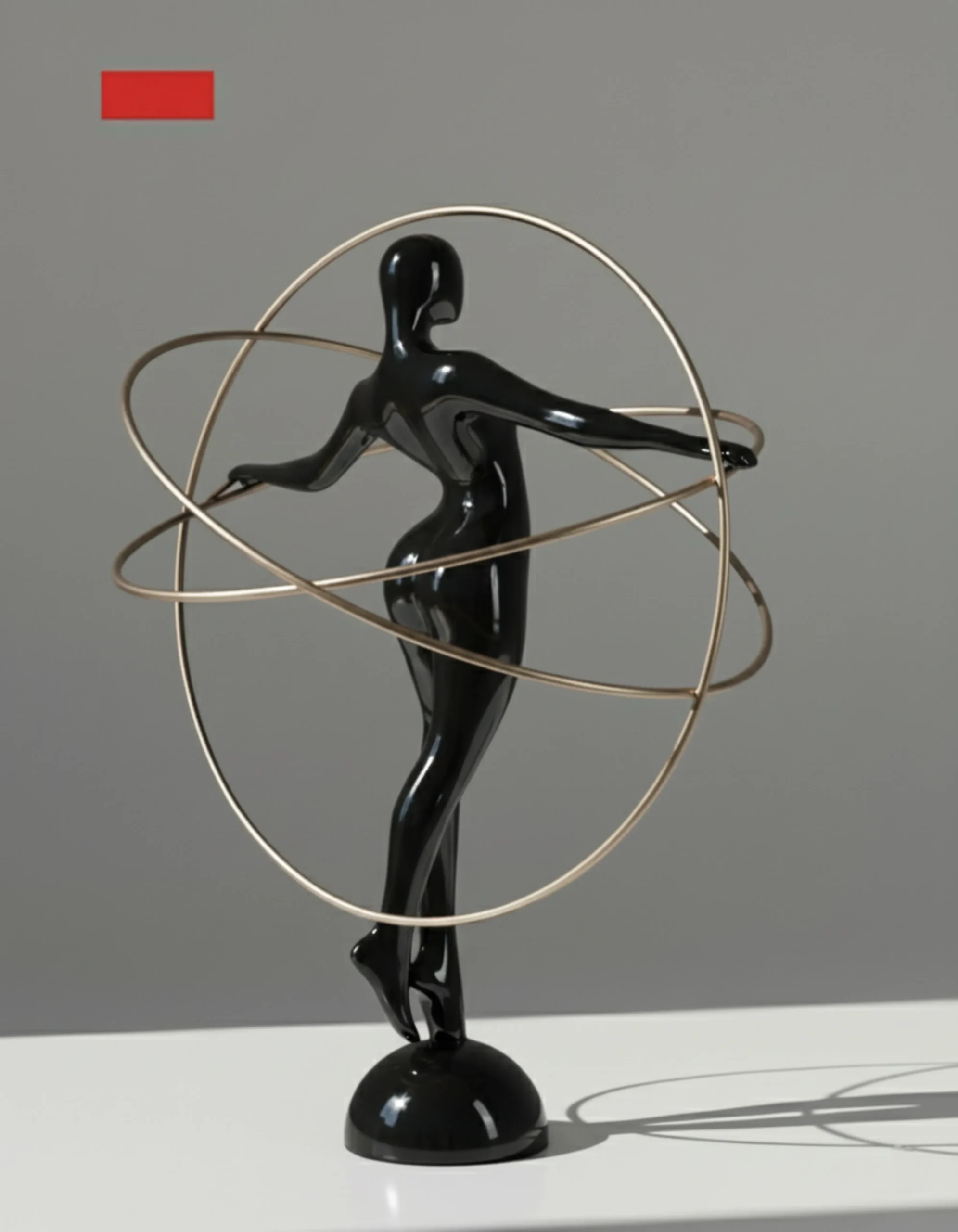 She in Orbit embodies balance – a quiet strength wrapped in fluid grace. Her form stands still while the steel rings around her seem to drift, echoing the rhythm between freedom and control.