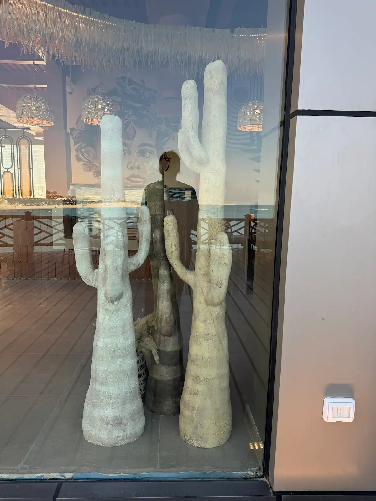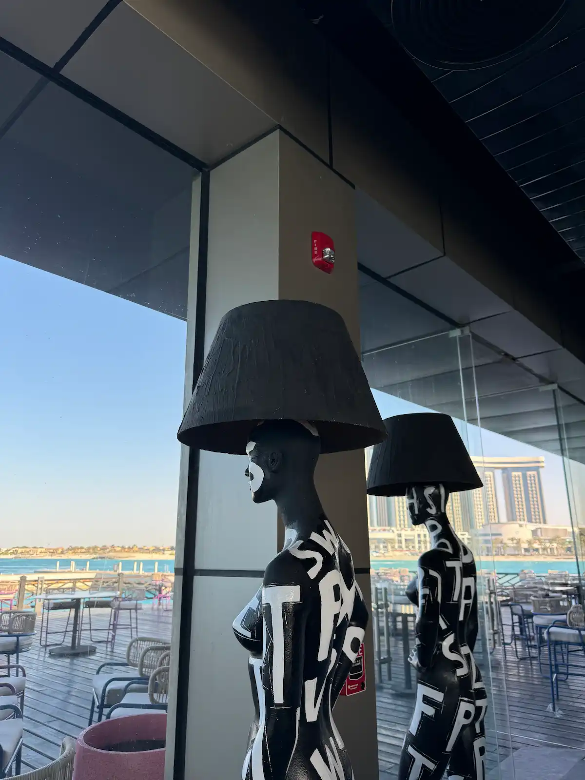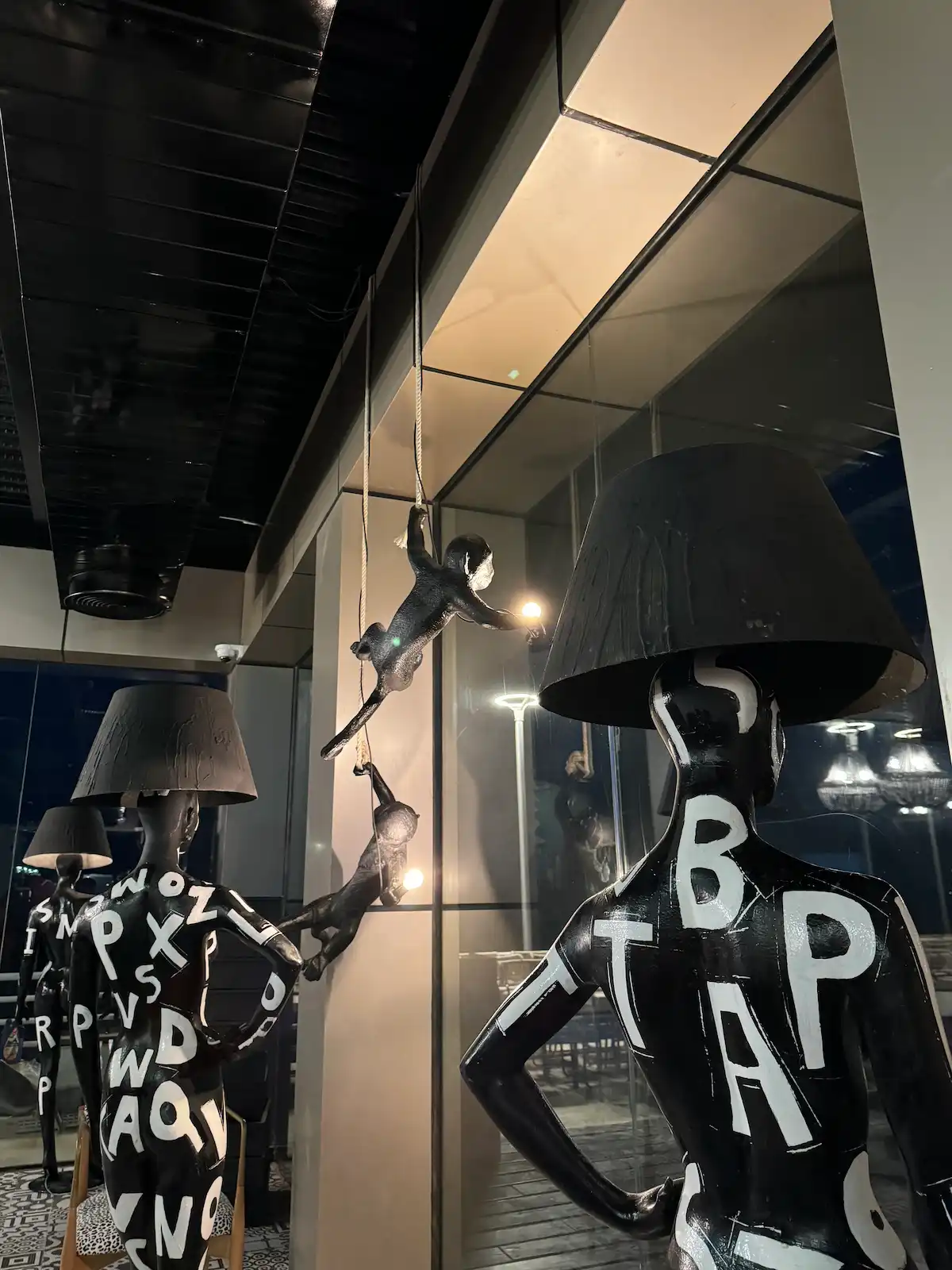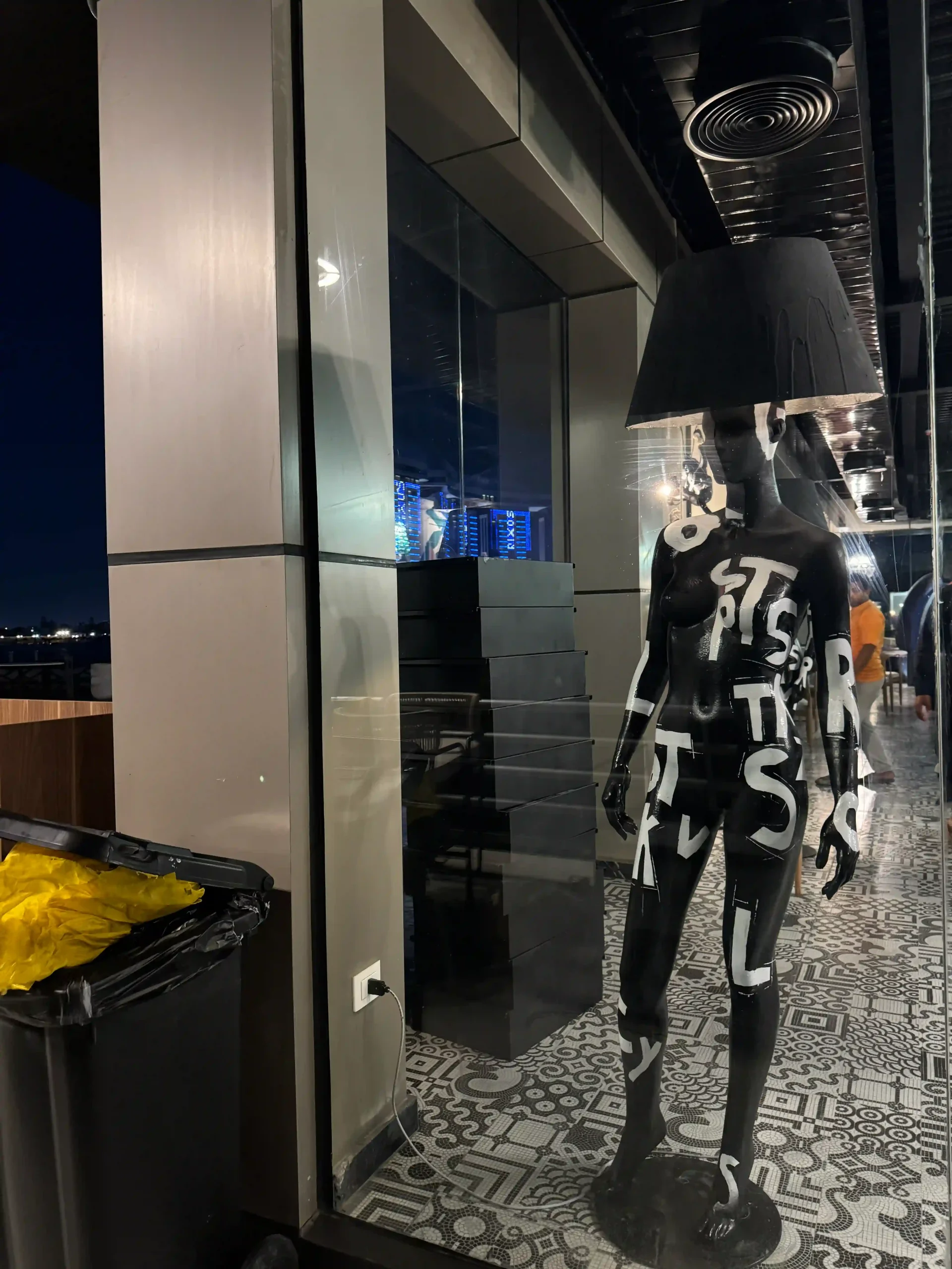 In the window display of an art gallery within Rixos, a unique lamp made of black and white letters stands 1.8 meters tall. This lamp, adorned with graffiti, creates fascinating reflections on its surface.